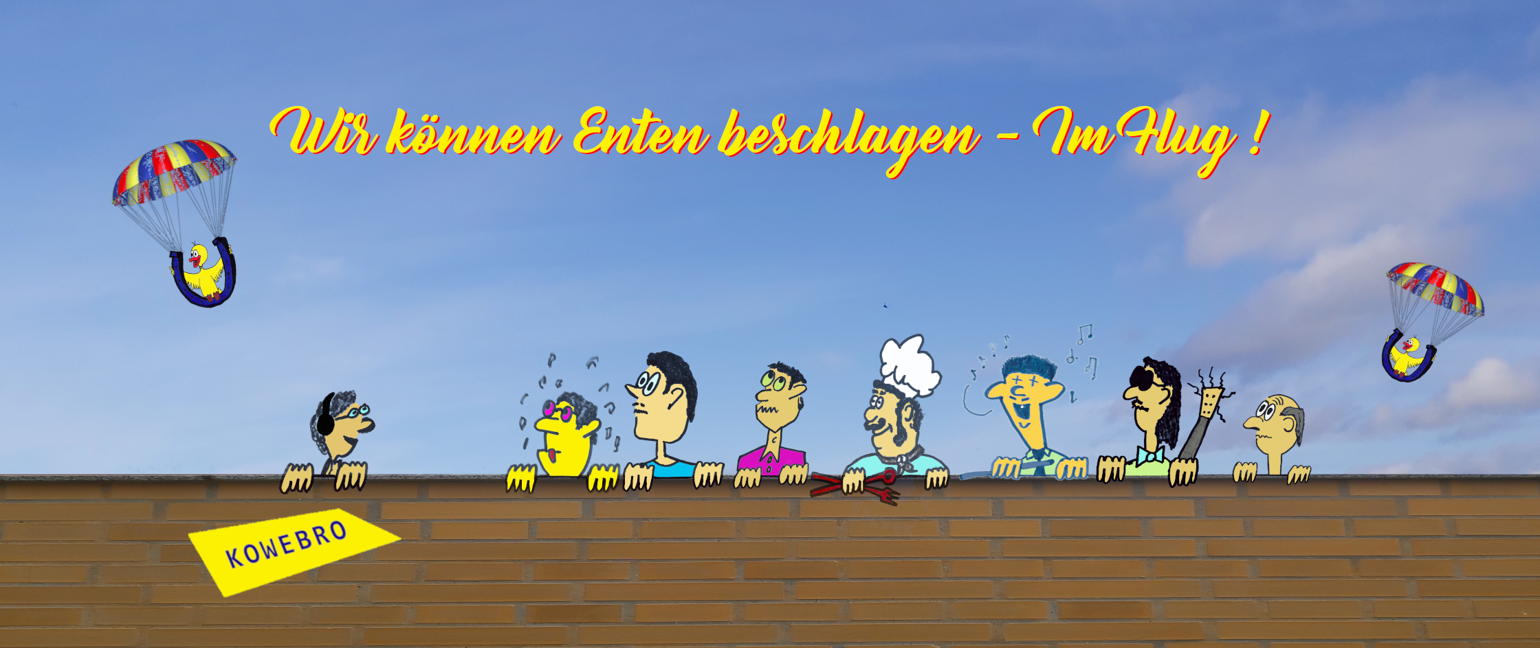 Das Erkennungszeichen von KOWEBRO ist die Ente (mit oder ohne Hufeisen). Dieses überaus kluge, intelligente, putzige, lustige, listige, schnelle, kreative, stimmlich veranlagte, gut aussehende und Eier legende Vögelchen ist für uns Lebensinhalt und Mission zugleich.